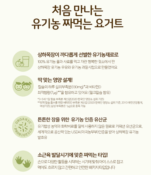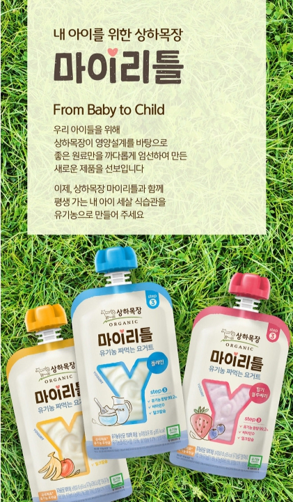 상하목장이 까다롭게 선별한 유기농 원료로 만든 아이부터 어른까지 안심하고 먹는 짜먹는 요거트입니다.